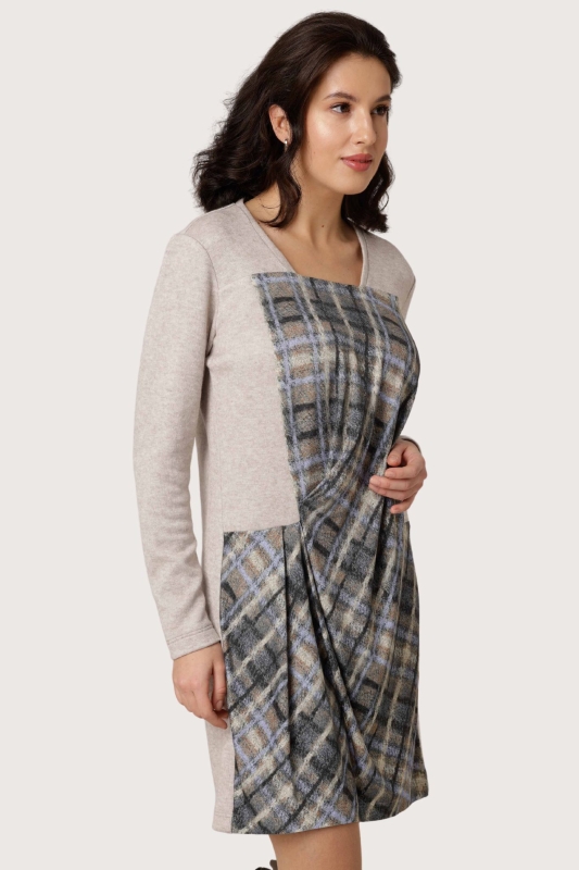 Produktinformation: Modee Kleid Bequemes Kleid im Materialmix aus bedrucktem Jersey und kuscheligem Feinstrick-Jersey. - Vorderteil aus Jersey mit Karodruck und seitlicher Drapierung - schmaler Uni Langarm Rückenlänge in Gr. 38 ca. 90cm